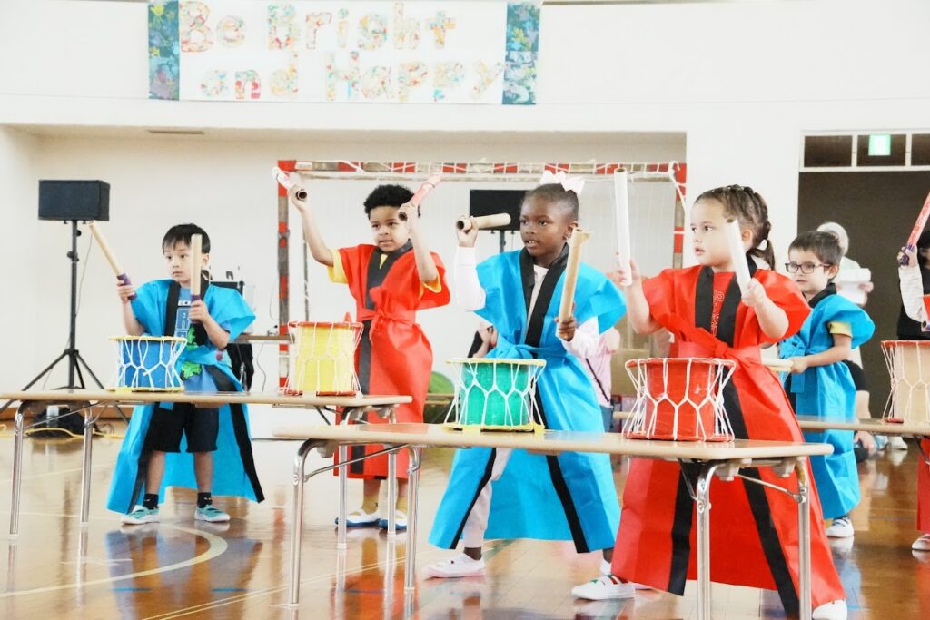 プリスクールは「Living in Color」をテーマに、それぞれが自分の個性や強みを発揮しながら取り組みました。歯科大学の大きな体育館で、多くの観客の前に立つのが初めての子どもたちも多く、緊張しながらも勇気を持って一歩を踏み出していました。